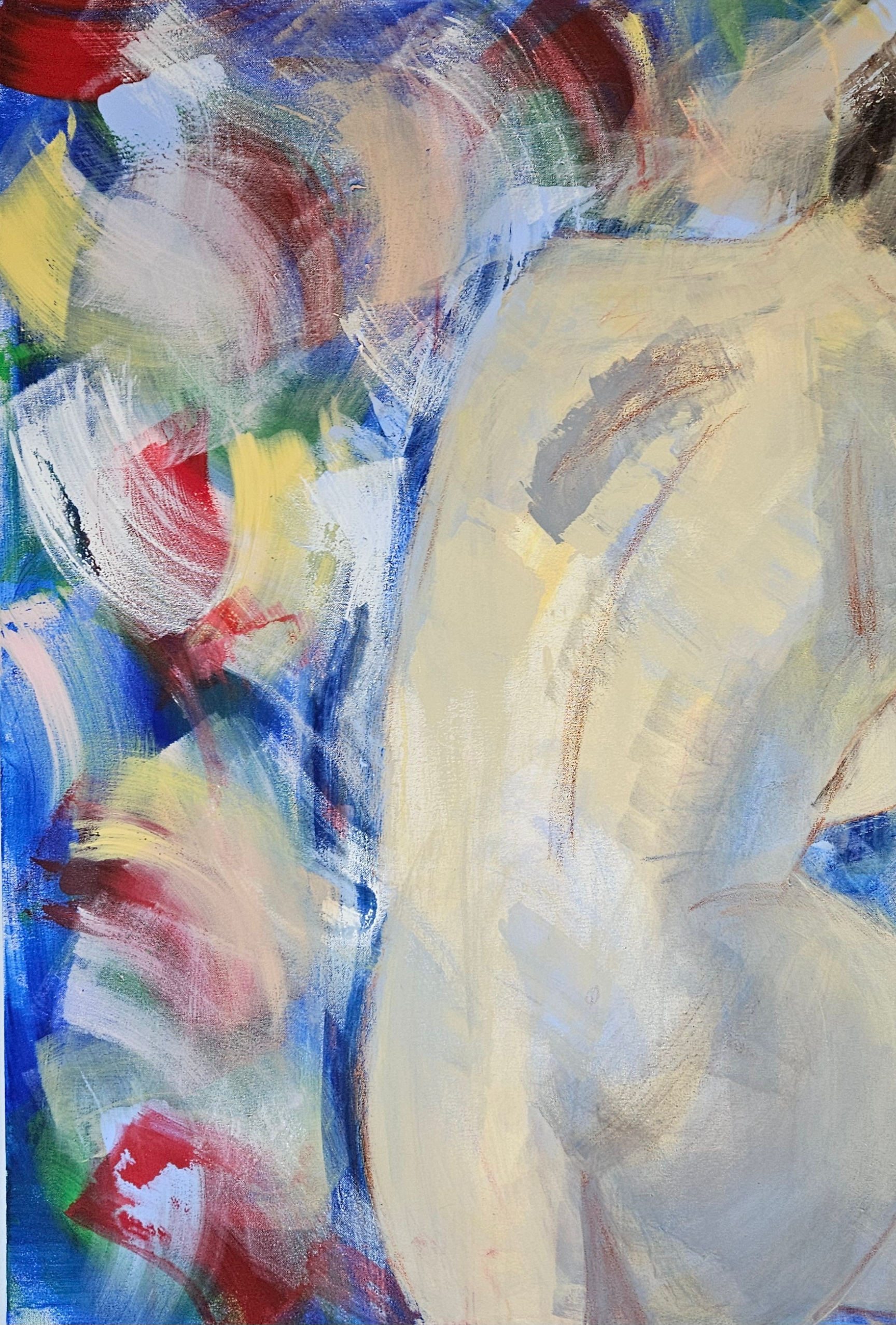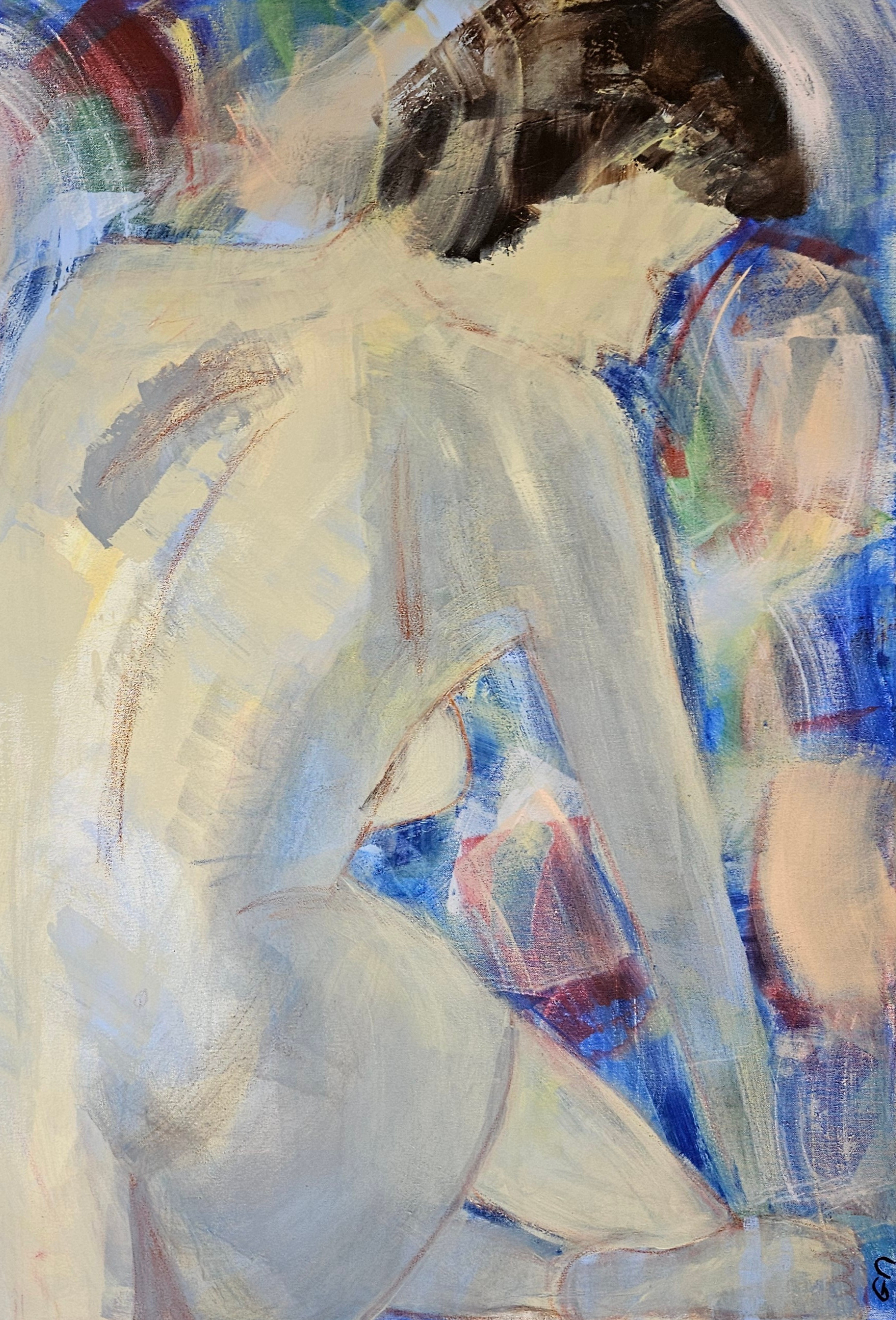 Dans cette œuvre, j’ai cherché à capturer la fragilité et la douceur d’un instant intime à travers des touches semi-abstraites. Les couleurs vives qui dansent autour du corps créent une énergie vibrante, comme une aura qui enveloppe la silhouette. Je voulais transmettre la beauté naturelle et la délicatesse humaine, invitant à la contemplation et à l’évasion dans un univers où la sensibilité prend vie.