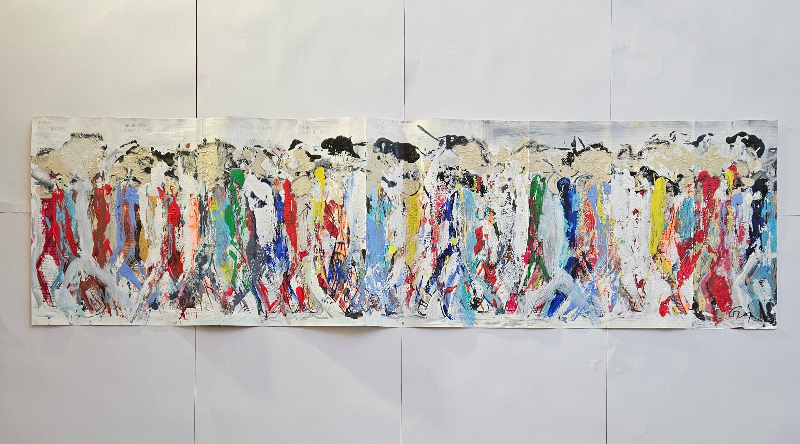 Dans cette œuvre, j’ai voulu capturer l’effervescence humaine, ces silhouettes en marche racontent un flux continu de vies et d’histoires. Avec des couleurs vives et des formes naïves, j’exalte la diversité et le mouvement. Elle insuffle une dynamique positive et vibrante, prête à animer et à vivifier l’espace qu’elle occupe, invitant à ressentir l’énergie des foules en mouvement. Peinture acrylique sur un plan cartonné à encadrer. Cette idée m’est venue lorsque je faisais la queue pour entrer dans la foire internationale d’art contemporain à Paris.