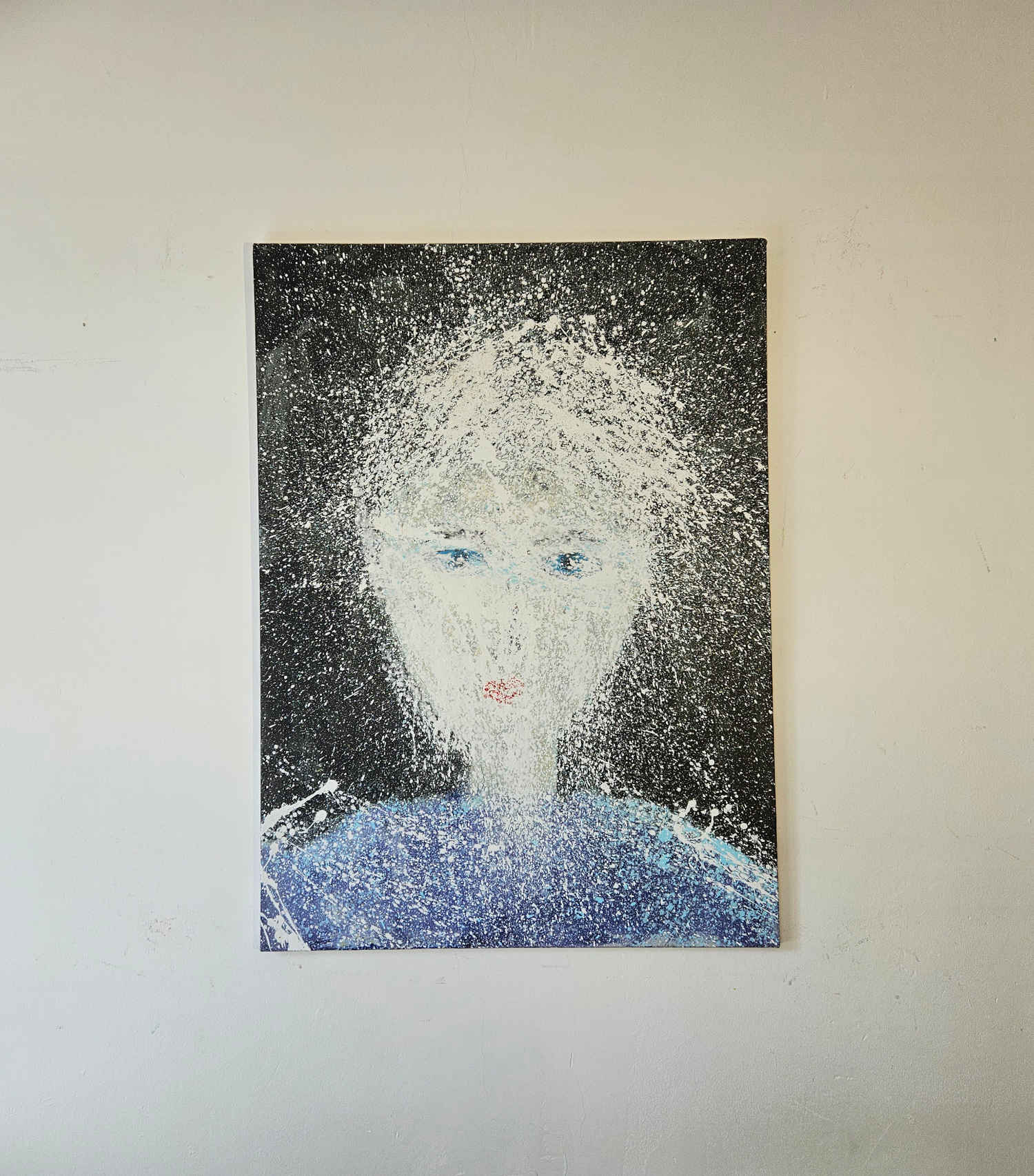 Dans cette œuvre, j’ai voulu capturer la fragilité et la lumière intérieure d’une femme mystérieuse. L’acrylique me permet d’obtenir cette texture éthérée, presque comme une aura qui l’enveloppe. Les touches de bleu transmettent calme et douceur, tandis que le contraste noir et blanc accentue son intensité. Cette peinture invite à la contemplation, insufflant une énergie apaisante mais profonde dans votre espace.