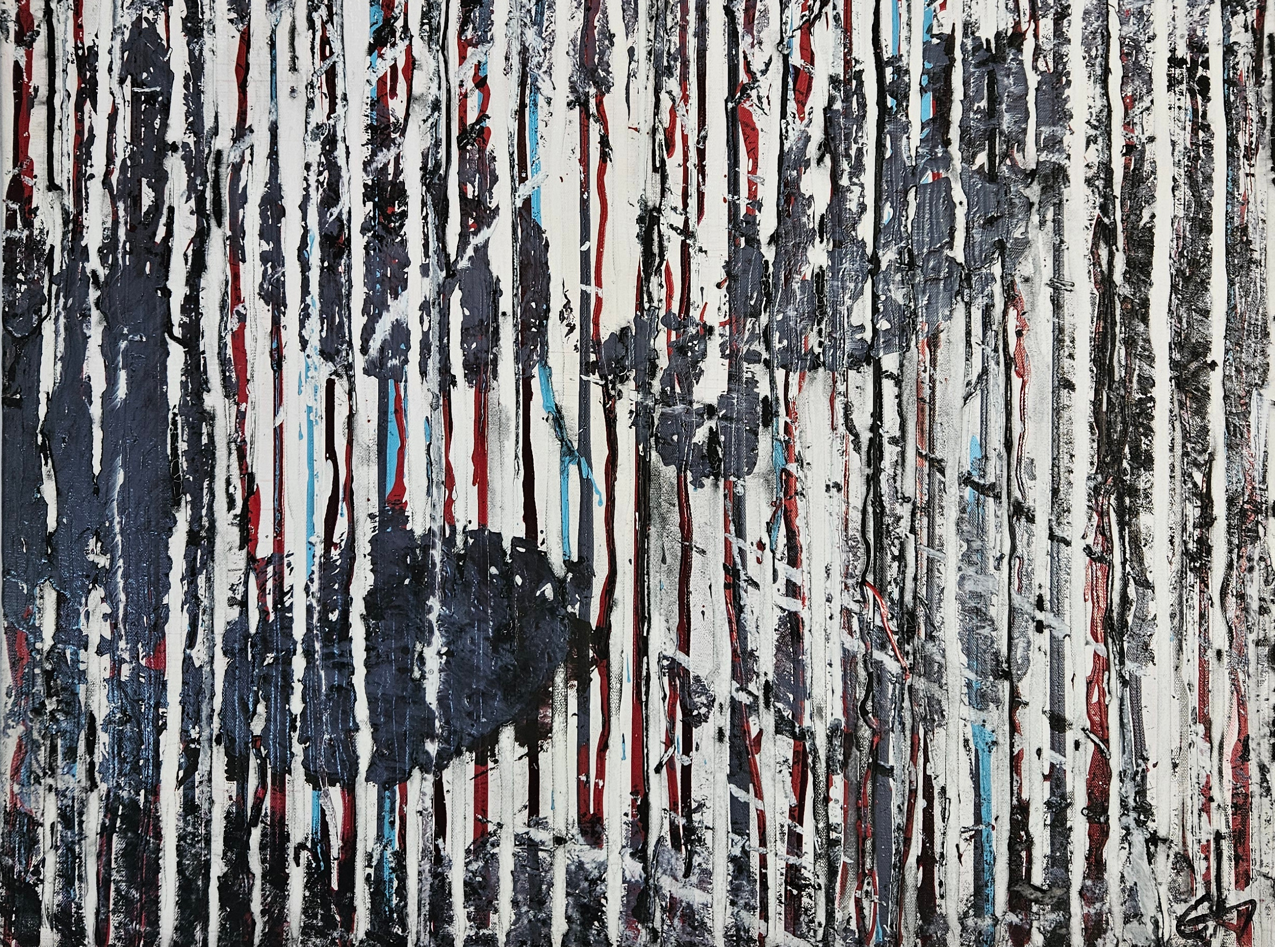 Tableau contemporain abstrait peint par Guillaume Marchat, suggérant des poissons noirs striés. Ces stries créent une impression de volume.