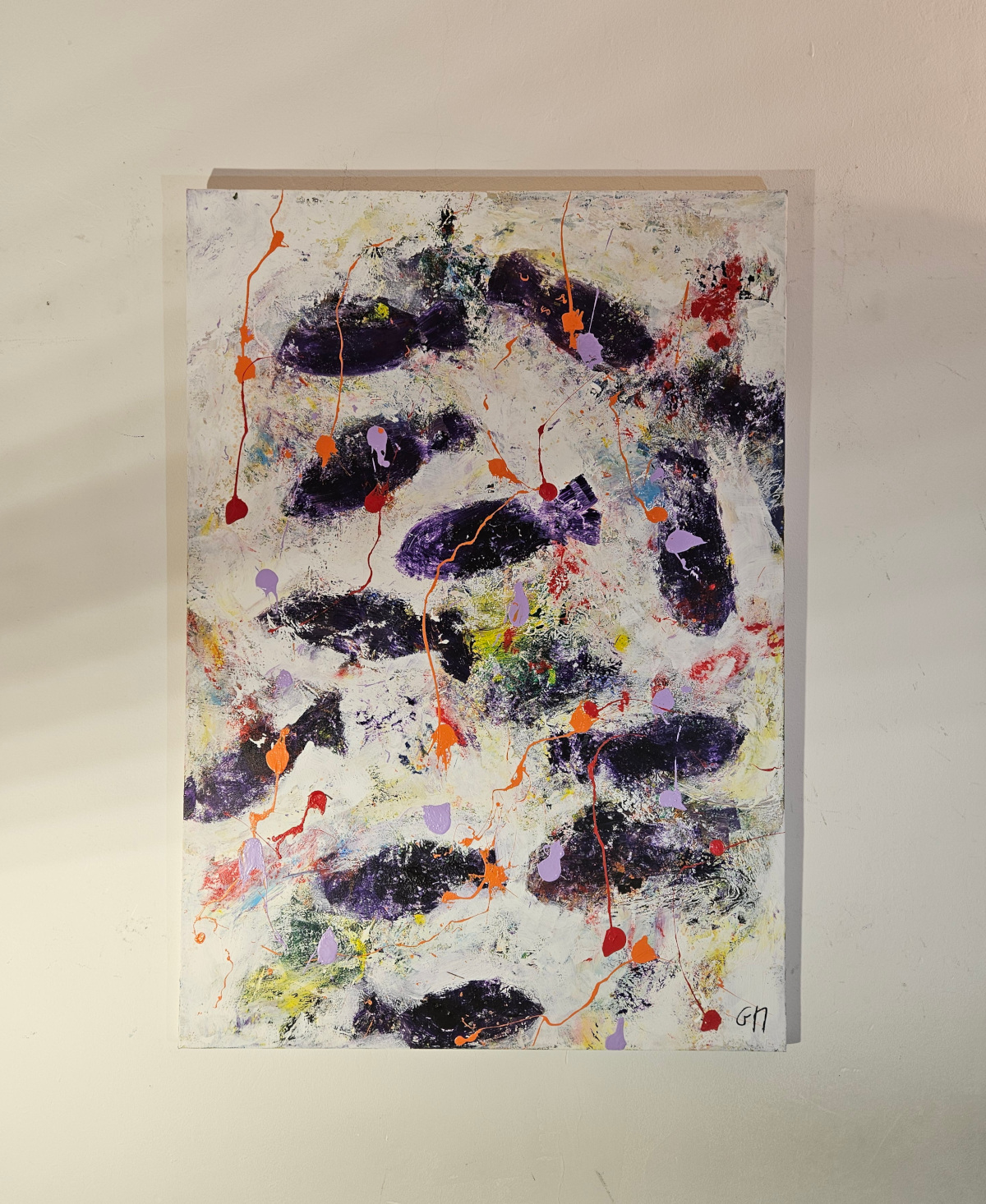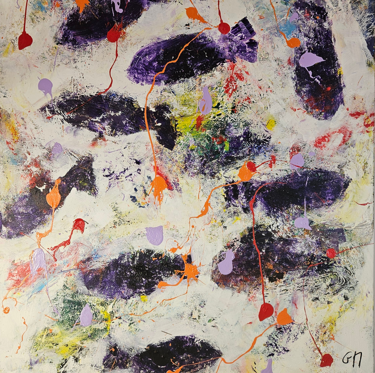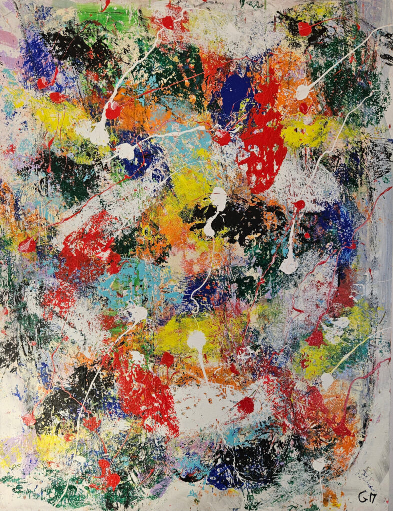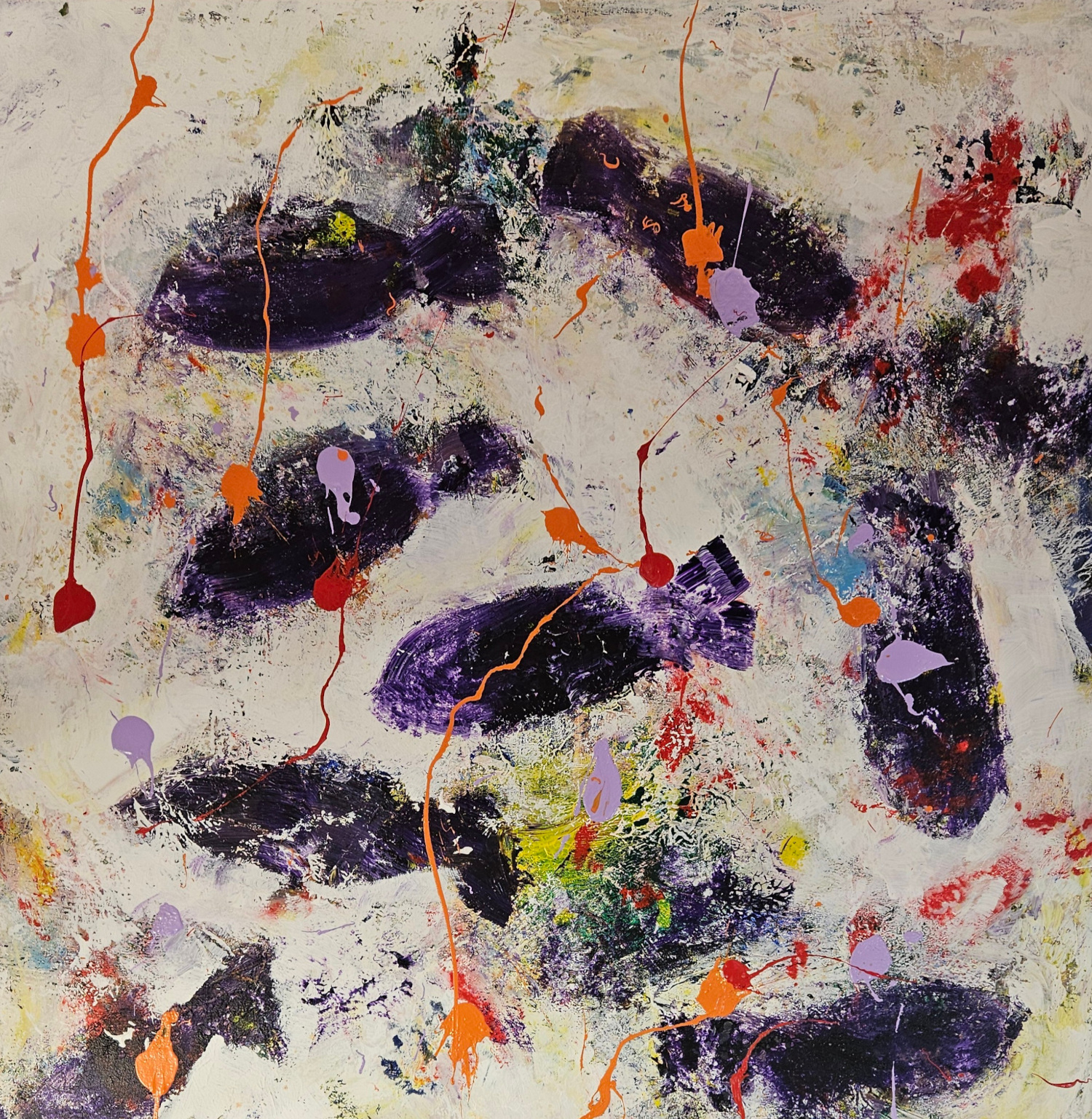 Dans cette œuvre, j’ai voulu capturer l’énergie vibrante et mystérieuse des profondeurs marines. Les touches de violet profond et les éclaboussures d’orange et de rouge évoquent des poissons en mouvement, libres et insaisissables. J’ai utilisé l’acrylique pour donner vie à cette danse abstraite, invitant à ressentir la fluidité et la force de la nature dans votre espace.
