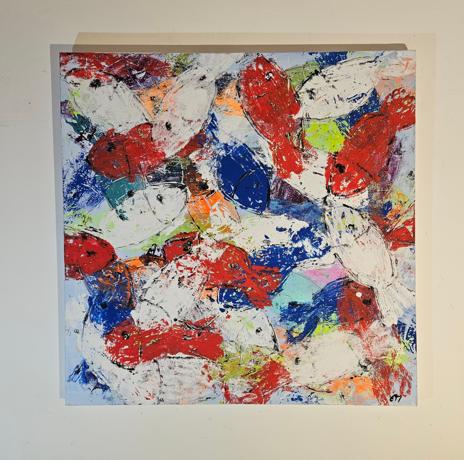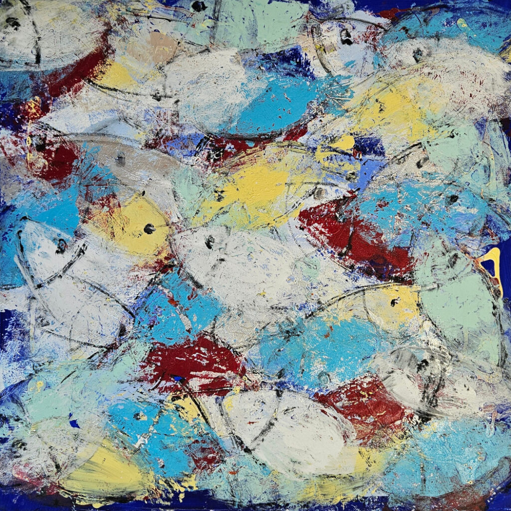 Tableau contemporain peint par l’artiste français Guillaume Marchat représentant des poissons blancs, bleus, rouges. On ressent sur la toile le mouvement du banc de poissons.