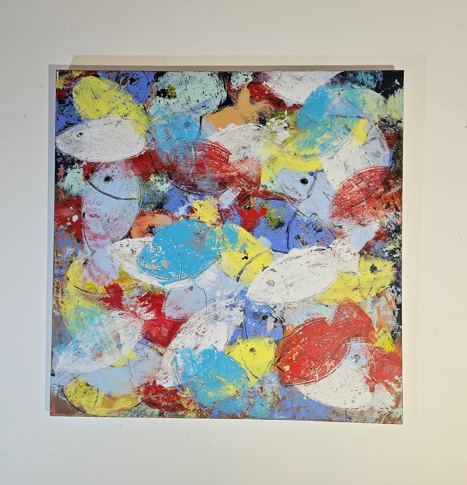 Tableau contemporain peint par l’artiste français Guillaume Marchat représentant des poissons blancs, jaunes, bleus, rouges. On ressent sur la toile le mouvement du banc de poissons.