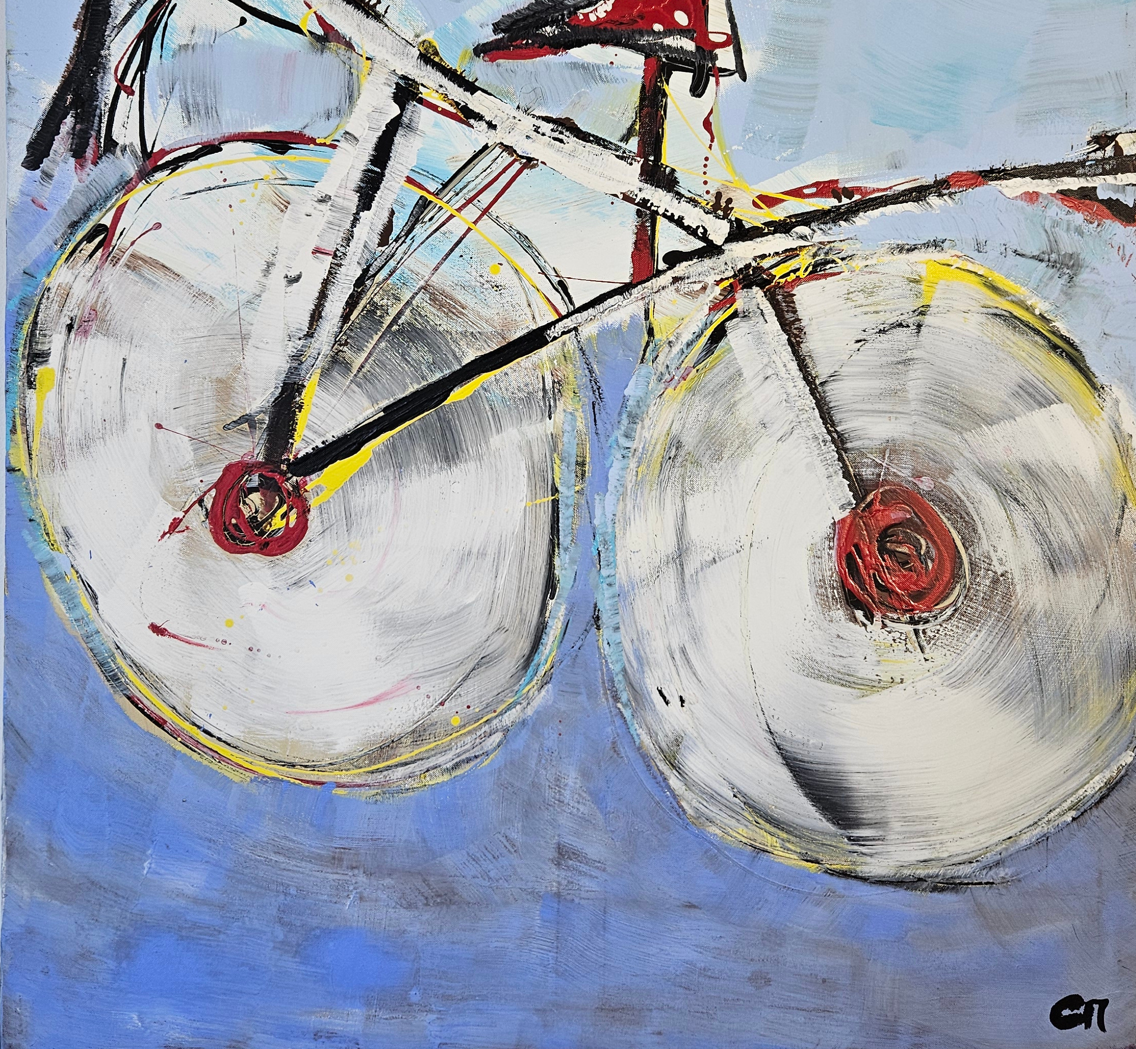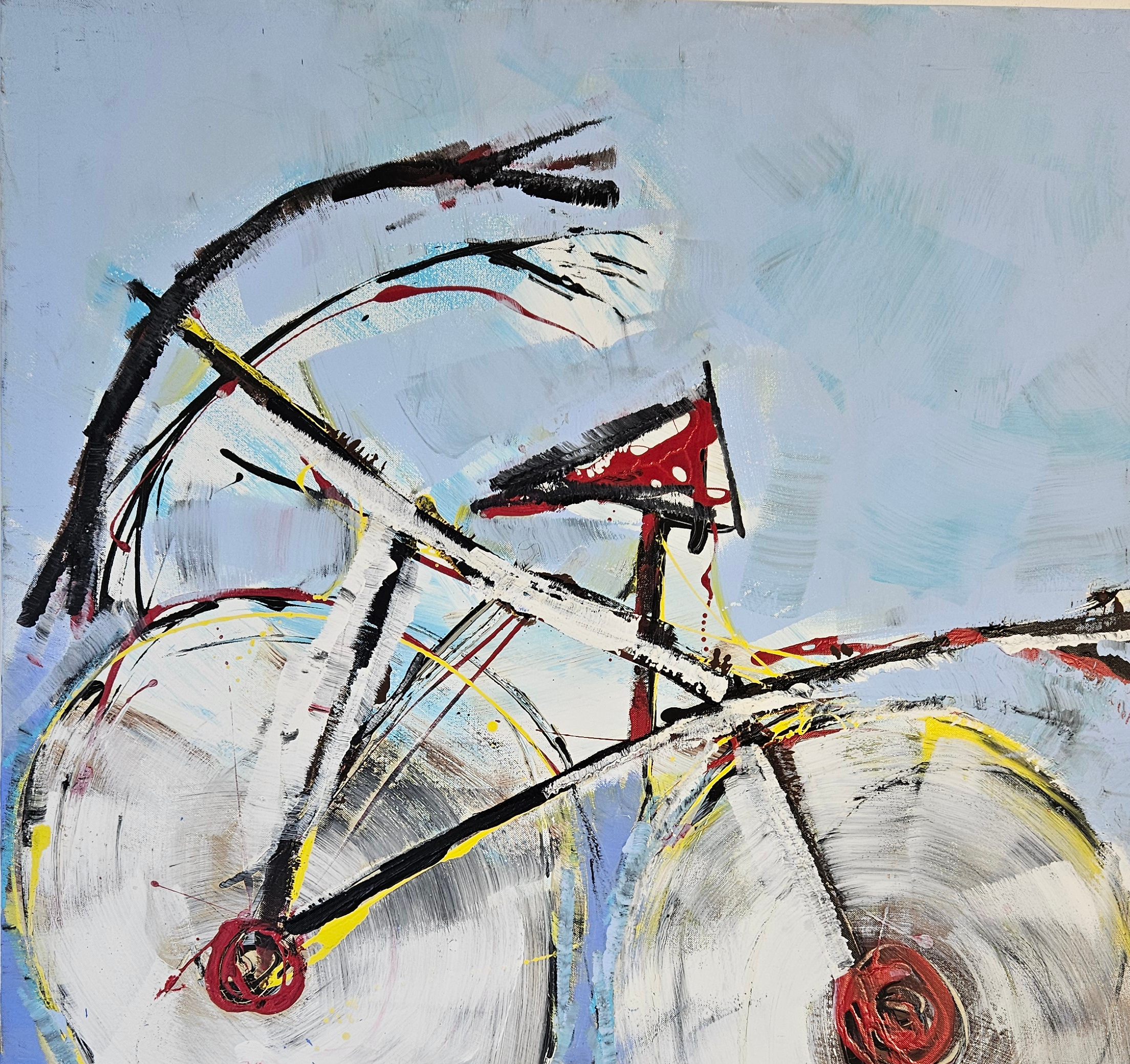 J’ai créé cette œuvre avec une énergie joyeuse et une touche naïve, pour capturer la légèreté du mouvement d’un vélo. Les formes semi-abstraites et les couleurs vives traduisent la vitesse, la liberté et la spontanéité. Je voulais que cette peinture apporte une dynamique vibrante et une sensation d’évasion dans votre espace, inspirant l’envie de partir à l’aventure avec enthousiasme.