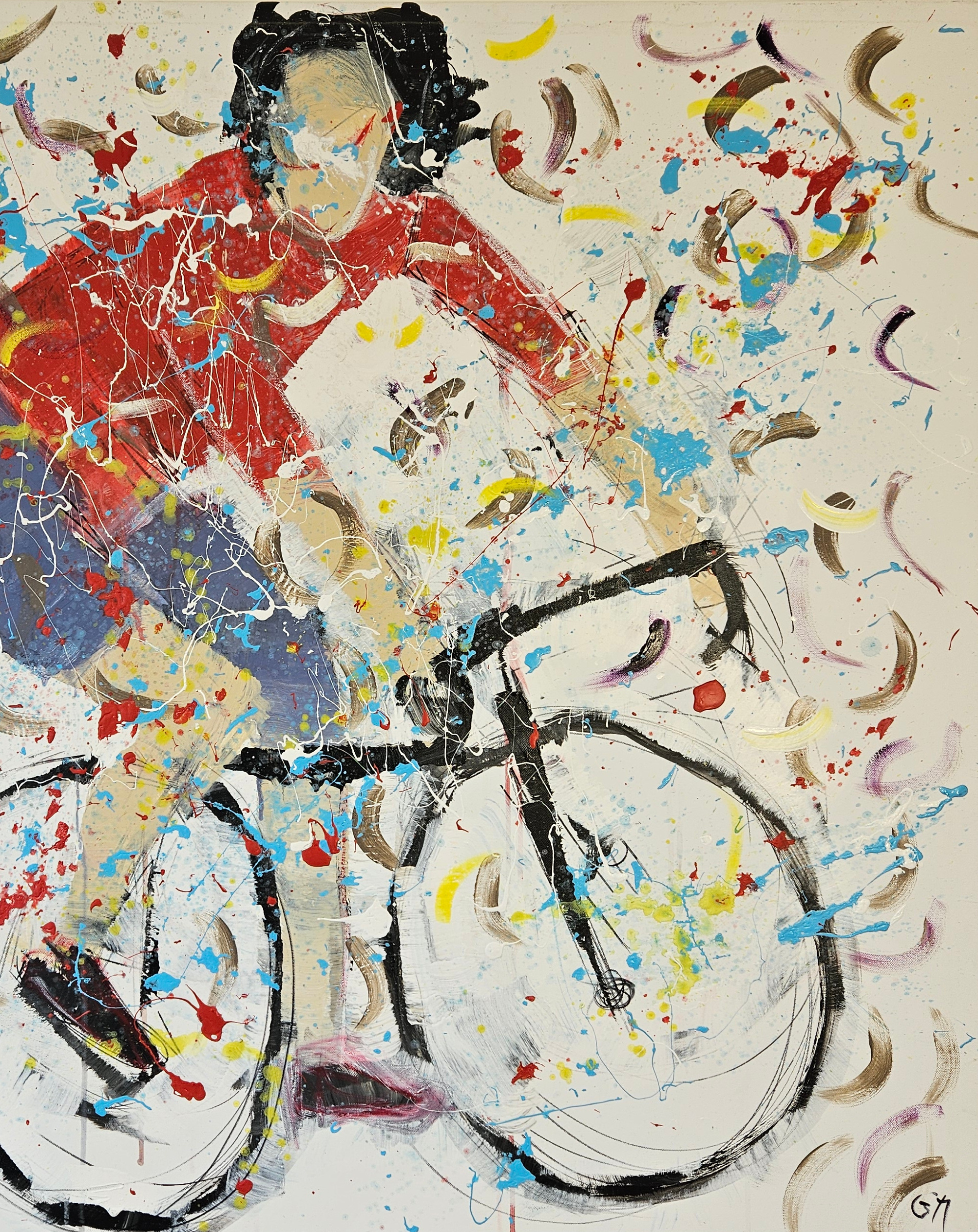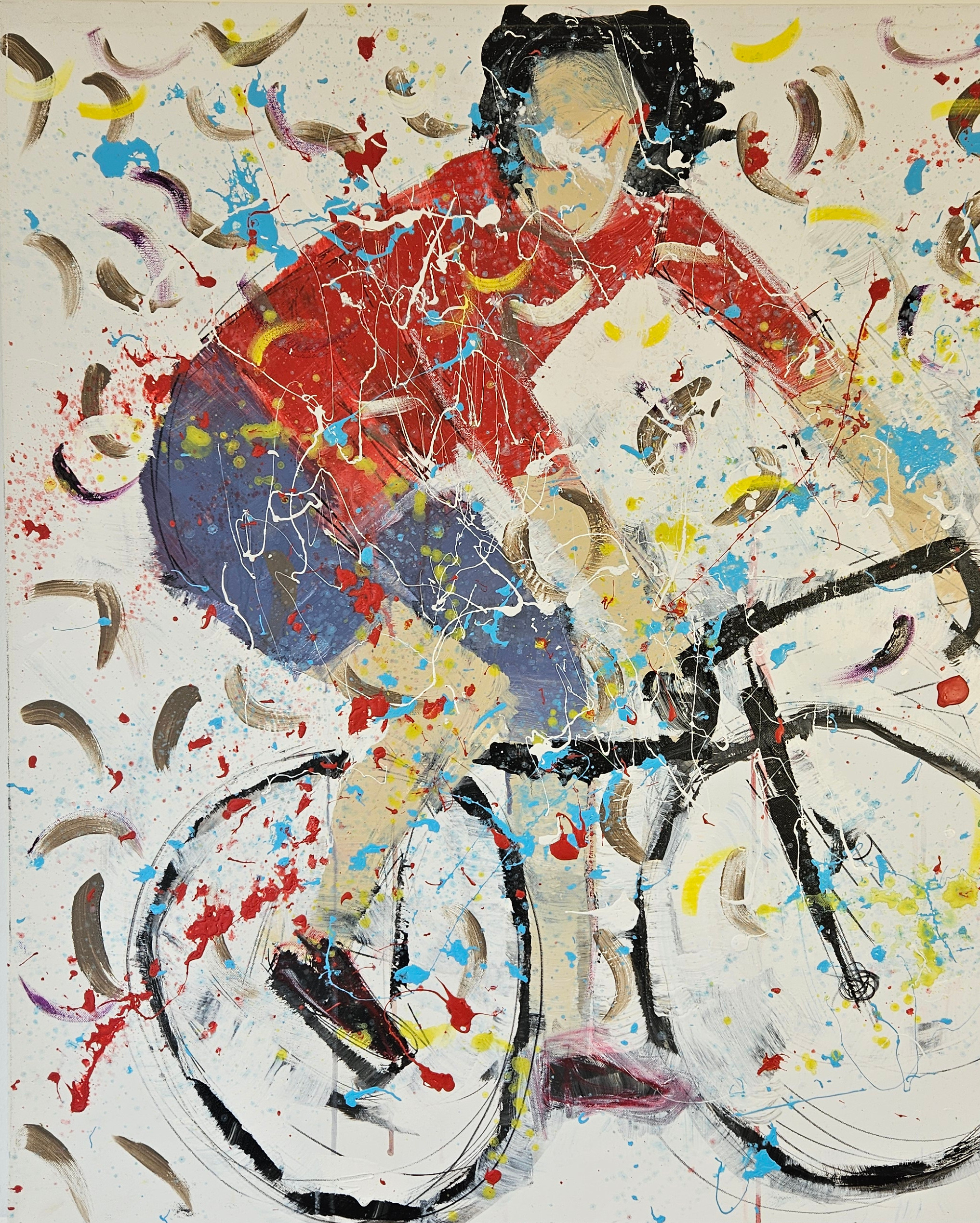Tableau contemporain minimaliste peint par Guillaume Marchat, représentant un cycliste au maillot rouge. Les projections de peinture révèlent une impression de mouvement et de vitesse.