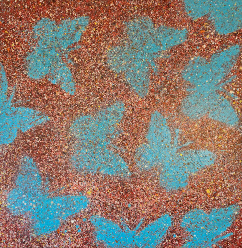 Papillons bleus sur fond rouge peinture moderne acrylique sur toile 100x100cm